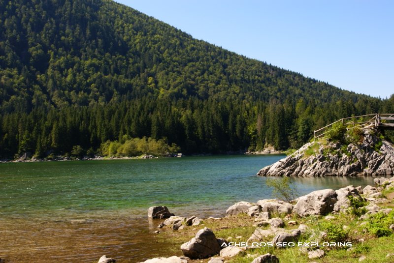 Il lago del Predil e’ situato a una decina di chilometri a sud di Tarvisio, in un’antica conca glaciale a quota 960 ; la forma e’ quasi rettangolare e misura m. 1300 ca. x 500 . Raggiunge una profondita’ massima di 35 metri. Le acque sono limpide e fredde, d’un colore verde azzurro intenso; un’ isoletta , relitto di un arco morenico in parte distrutto, in parte sommerso, determina localmente un paesaggio molto suggestivo. Caratteristica del lago e’ il suo livello idrico variabile. Infatti a seconda delle stagioni e degli eventi atmosferici, puo’ capitare che vaste aree siano per lunghi periodi, totalmente ricoperte di acqua o interamente a secco.