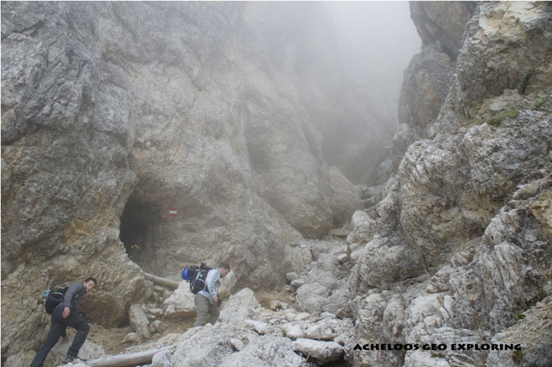 E’ un complicato groviglio, il più ardito sistema di gallerie realizzato nella Grande Guerra. Oltre al ramo principale, costruito per piazzare la mina sotto le postazioni austriache dell’anticima, ci sono la galleria di spalla il cui sbocco esterno sull’anticima servì come uscita per le pattuglie italiane di assaltatori dopo lo scoppio della mina e la galleria dell’artiglieria dalla quale i cannoni italiani tiravano verso il Sasso di Stria. Ed ancora: la galleria elicoidale, che partendo dalla Cengia Martini sbuca a quota 2668 dopo un percorso interno lungo circa 1150 metri ed il ramo orizzontale che correva parallelamente alla cengia offrendo riparo dal tiro austriaco. (www.dolomiti.org)